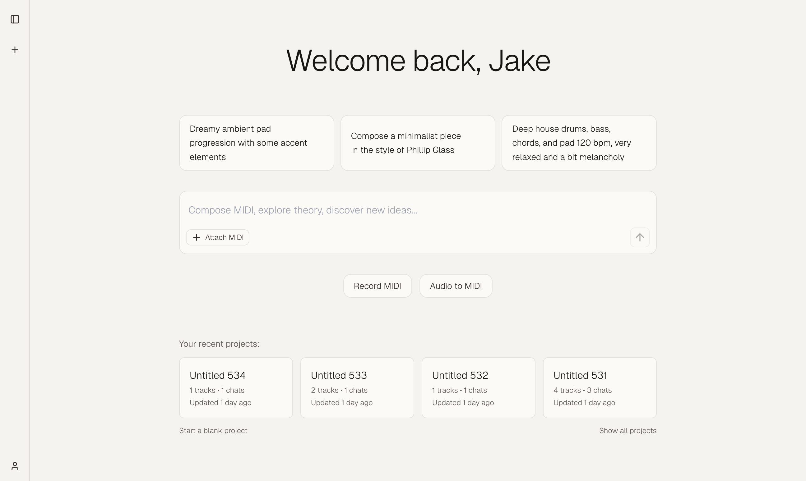 - Recent projects – List of your projects with name, last updated, and track/chat counts. Click a project to open it.