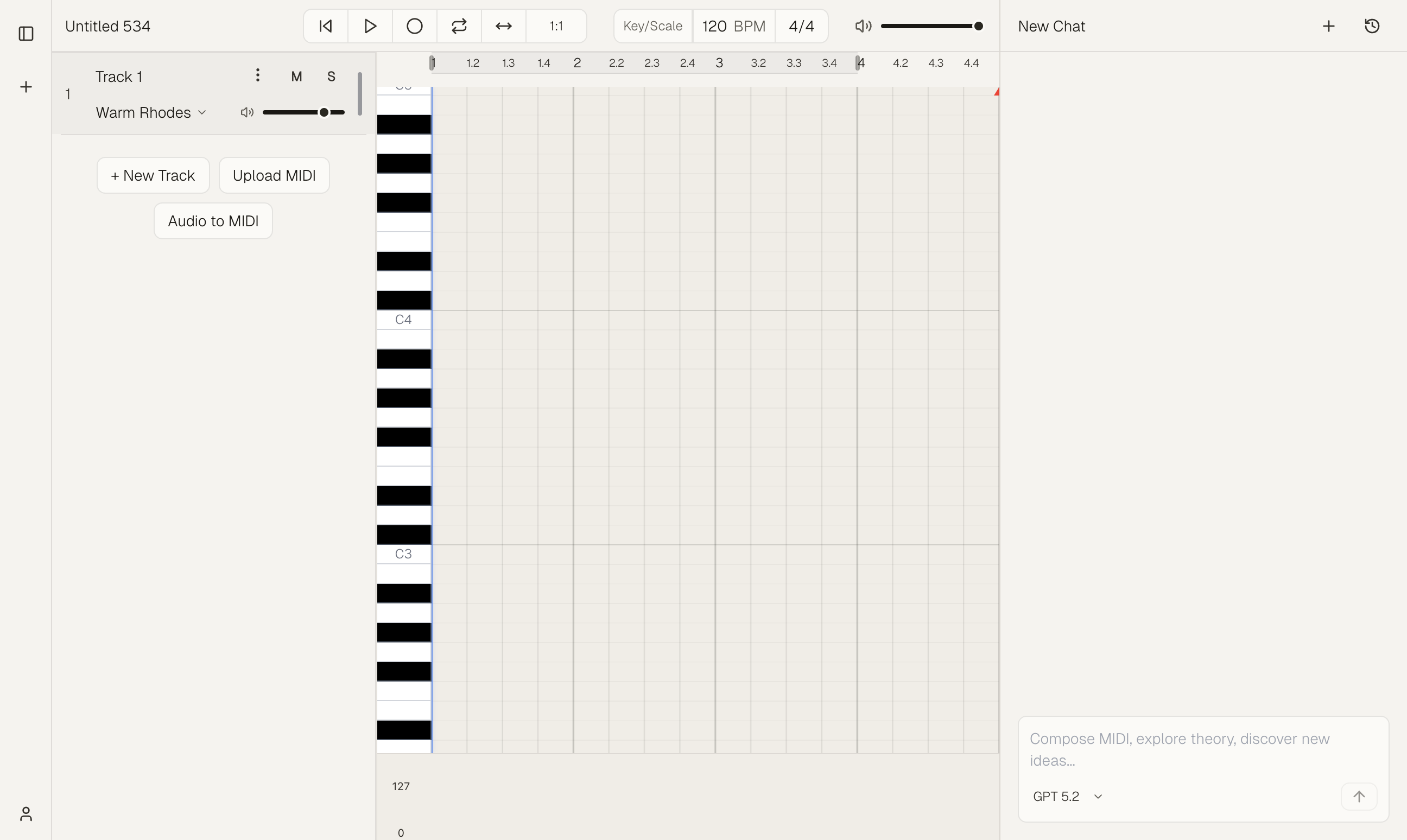 - The workspace opens with the piano roll in the center and the chat panel on the side.